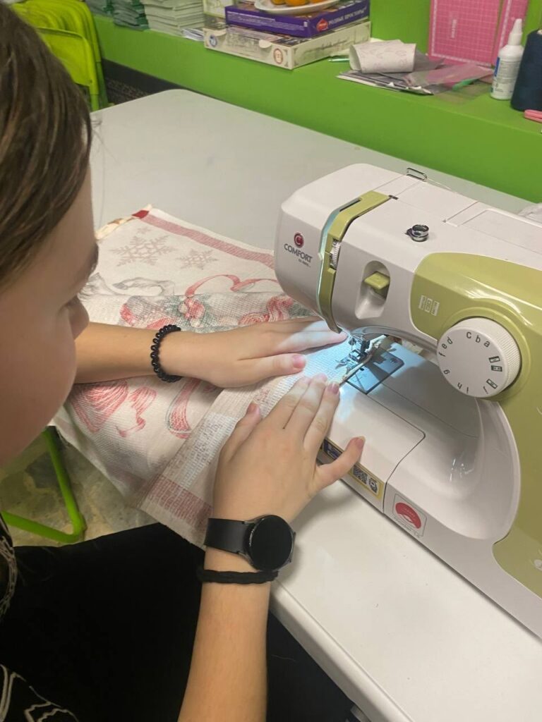 Наши юные ремесленники осваивают основы основы работы на швейной машинке: наметка, строчка в подгиб.